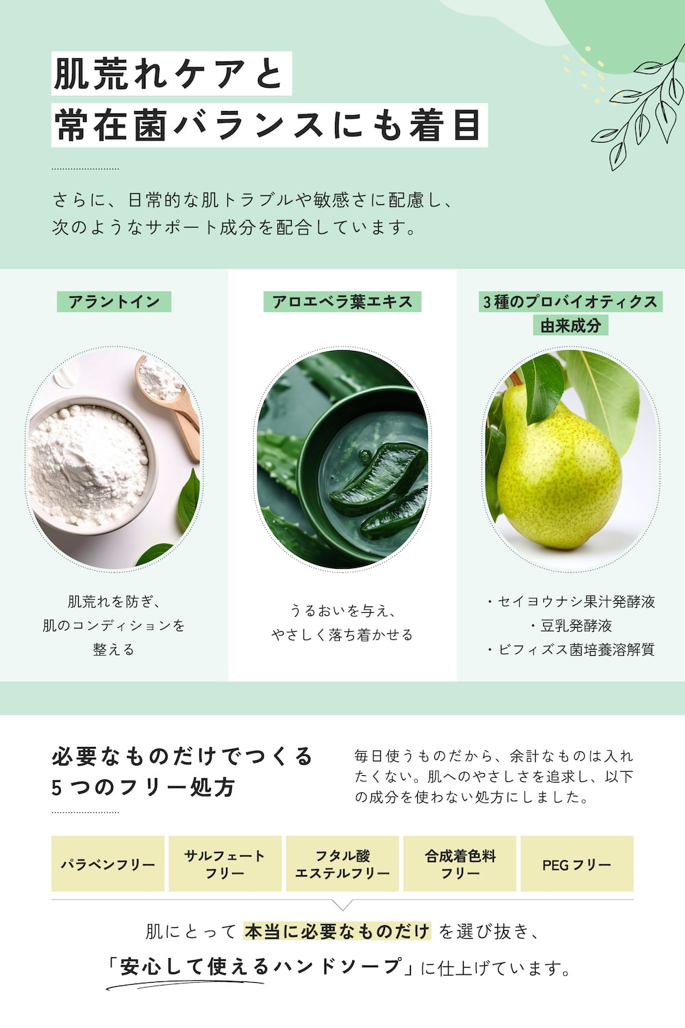 植物由来の成分を配合し、乾燥しやすく、頻繁に洗浄が必要な手肌に適したハンドウォッシュです。肌にうるおいを残しながら、しっとりと洗い上げます。適量をよく泡立てて洗い、水またはぬるま湯で洗い流してください。